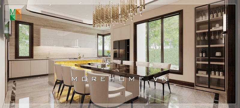 Nội thất phòng ăn liền bếp hiện đại được thiết kế để phù hợp với nhà biệt thự, mang đến sự tiện nghi cho người sử dụng.